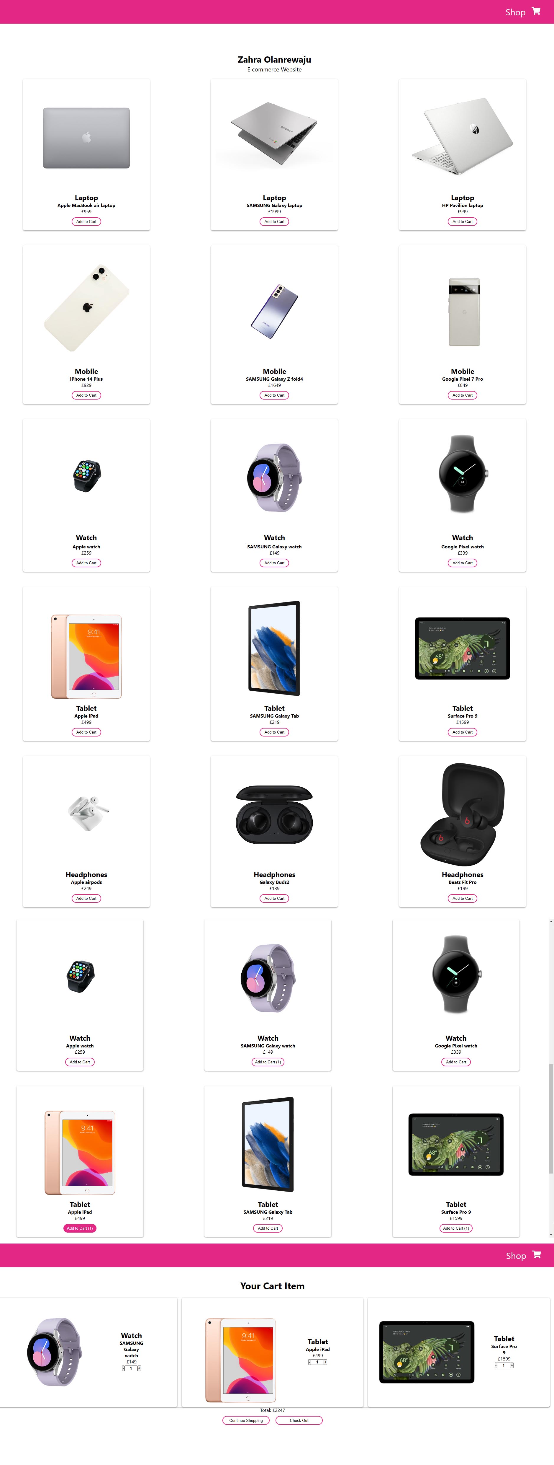 This React E-commerce shopping cart focuses on core concepts like have a well-organized file structure, navigation with React Router (Router, Route, Routes), and state management using a Context object createContext and Context Provider for efficient data sharing with product components. CSS styling adds the finishing touch for a visually appealing user experience.